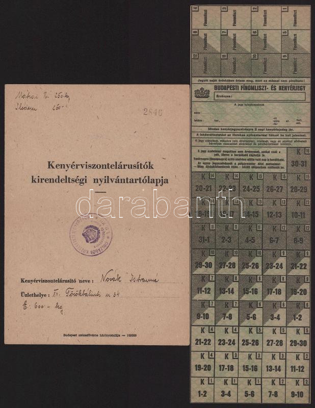 cca 1944-1945 Budapesti finomliszt és kenyérjegy ívben és kenyér-viszonteladók nyilvántartó lapja az Országos Közellátási Jegyközpont pecsétjével