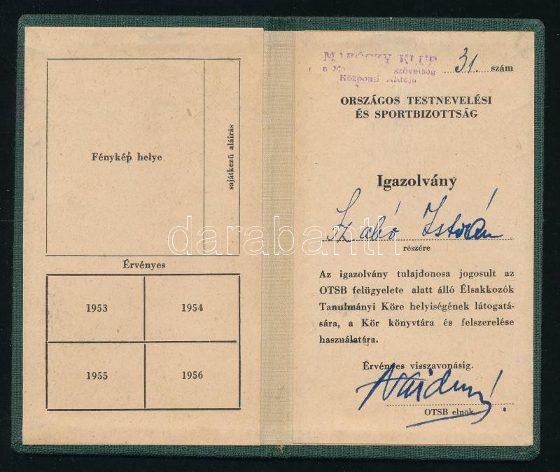 cca 1953 Országos Testnevelési és Sport Bizottság (OTSB) felügyelete alatt álló Élsakkozók Tanulmányi Köre helyiségeinek látogatására, könyvtárának és felszerelésének használatára jogosító igazolvány