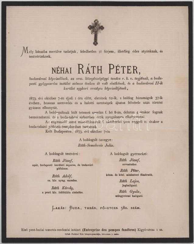 1873 Bp., Ráth Péter (1812-1873) gyógyszerész, az Országos Közegészségügyi Tanács tagja, a Budapesti Gyógyszerész Testület elnöke, országgyűlési képviselő halotti értesítője, 26,5x21 cm