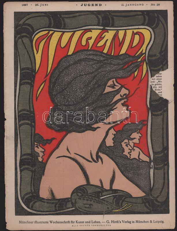 1898 Jugend. II. Jahrgang Nr. 12. 1897. Märcz. 20. München-Leipzig, G. Hirth's Verlag, 185-198 p. Szecessziós, színes címlappal, a címlap leszakadt. + 1897 II. Jahrgang Nr. 26. szám szecessziós, színes, de sérült címlapja, valamint egy színes, szecessziós illusztrációja egy lapon.