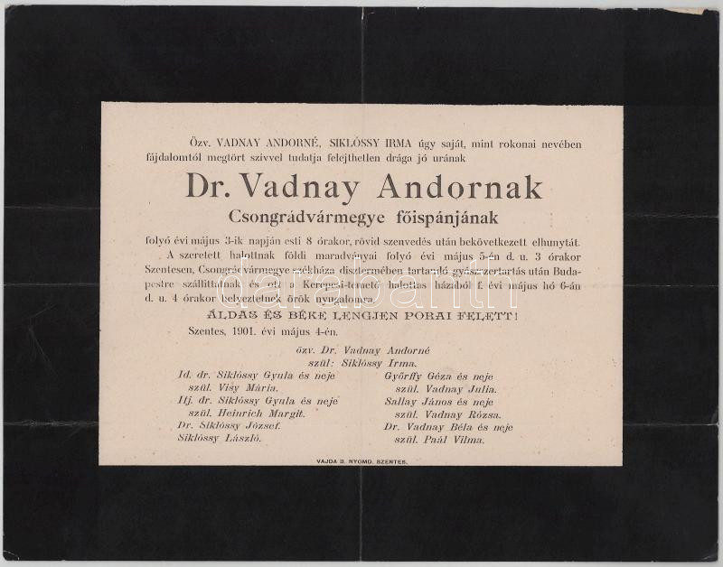 1901 Szentes, sajóvadnai Vadnay Andor (1859-1901) országgyűlési képviselő, Csongrád vármegye főispánjának halotti értesítője, kisebb lapszéli sérüléssel, 23x29,5 cm