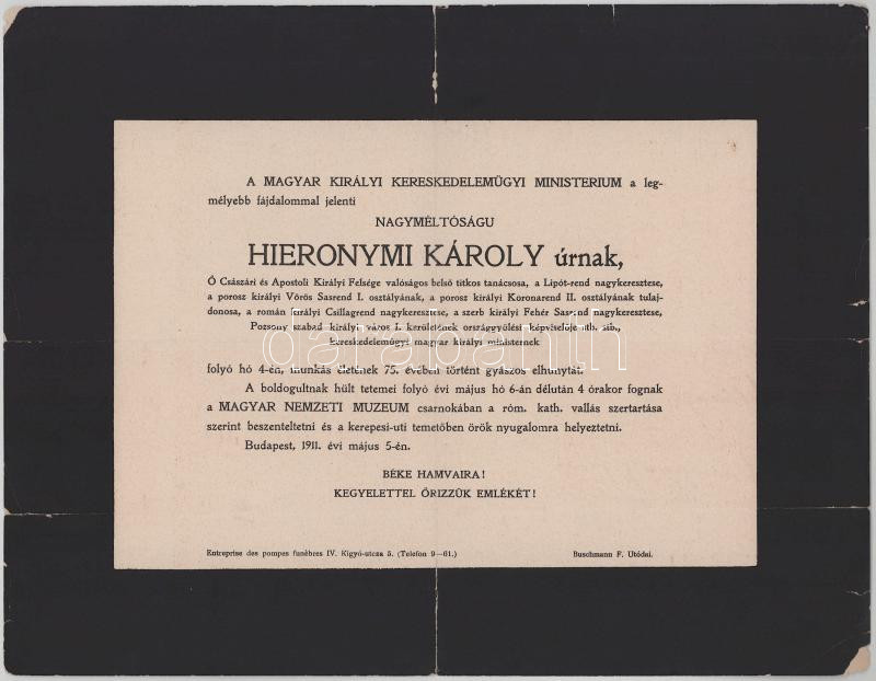 1911 Bp., Hieronymi Károly (1836-1911) valóságos belső titkos tanácsos, országgyűlési képviselő, volt belügyminiszter és kereskedelemügyi miniszter halotti értesítője, lapszéli sérülésekkel, 24x31 cm