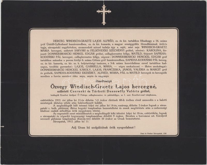 1912 Sárospatak, özv. Windisch-Graetz (Windischgrätz) Lajosné, szül. cserneki és tarkeői gróf Dessewffy Valéria (1843-1912) cs. és kir. palotahölgy, csillagkeresztes hölgy halotti értesítője, kis lapszéli sérülésekkel, 23x29 cm