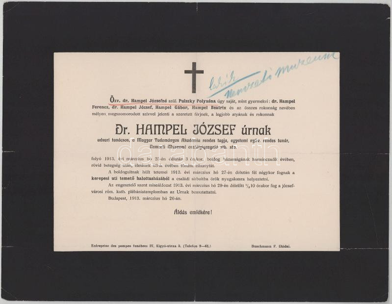 1913 Bp., Hampel József (1849-1913) udvari tanácsos, régész, múzeumigazgató, az MTA tagja halotti értesítője, kisebb lapszéli sérülésekkel, 24x31 cm