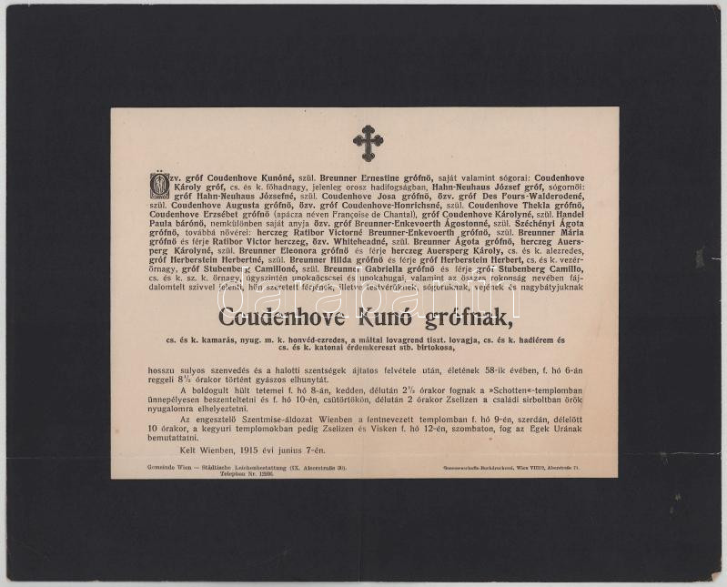 1915 Bécs, gróf Coudenhove Kunó (1858-1915) cs. és kir. kamarás, honvéd ezredes, a máltai lovagrend tiszteletbeli lovagja halotti értesítője, kisebb lapszéli sérüléssel, 24x29,5 cm