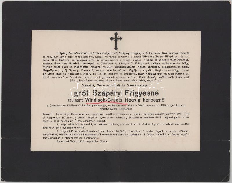 1918 Baden bei Wien, gróf Szapáry Frigyesné, szül. Windisch-Graetz Mária Hedvig (1878-1918) cs. és kir. palotahölgy, csillagkeresztes hölgy halotti értesítője, kisebb lapszéli sérülésekkel, 24x30 cm