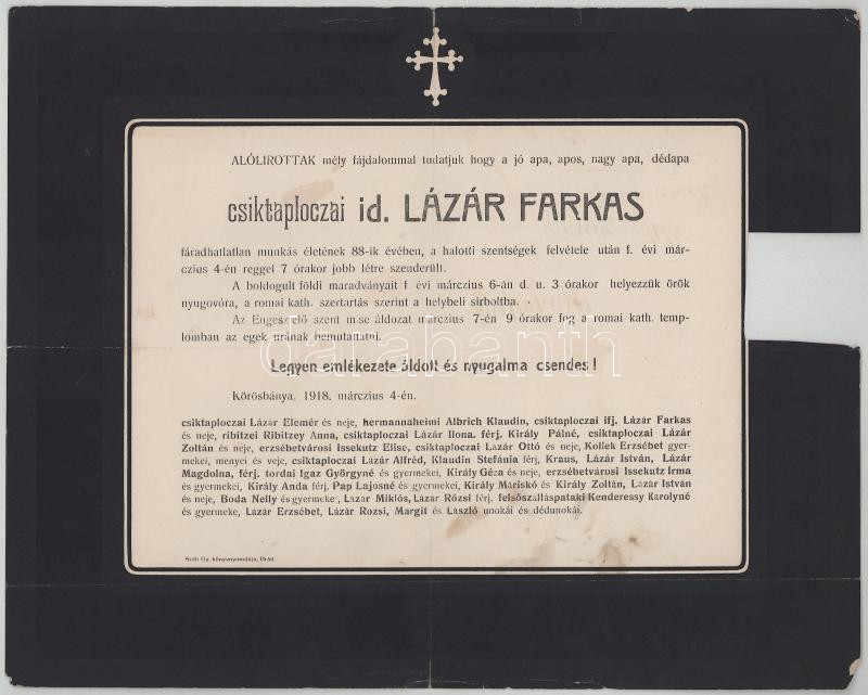 1918 Körösbánya, csiktaploczai Lázár Farkas (1830-1918) halotti értesítője, lapszéli hiánnyal, 24x30 cm