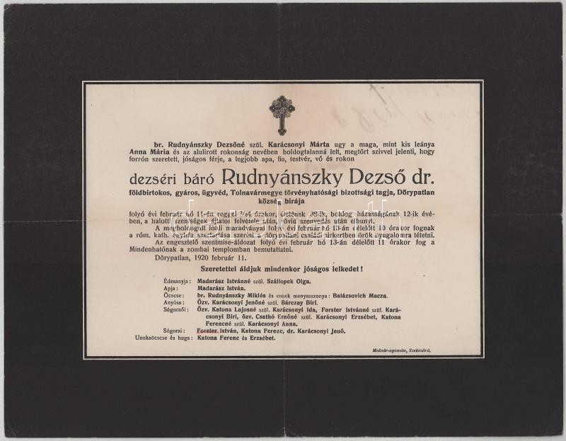 1920 Dőrypatlan, dezséri báró Rudnyánszky Dezső (1882-1920) földbirtokos, gyáros, ügyvéd, Dőrypatlan község bírája halotti értesítője, 23x29,5 cm