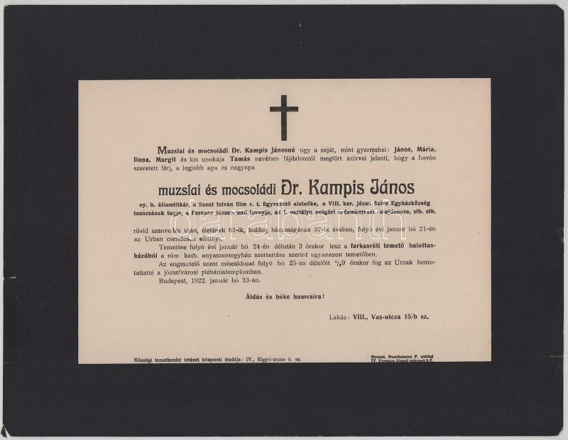 1922 Bp., muzslai és mocsoládi Kampis János (1861-1922) politikus, helyettes államtitkár, a Szent István Film Rt. ügyvezetÅ‘ alelnöke, a Ferenc József-rend lovagja halotti értesÃtÅ‘je, apró lapszéli sérülésekkel, 23x30 cm