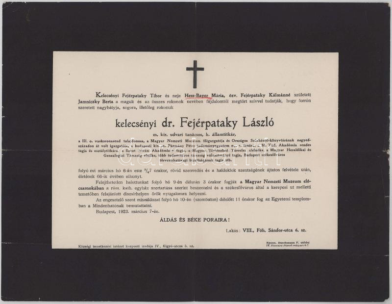 1923 Bp., kelecsényi Fejérpataky László (1857-1923) m. kir. udvari tanácsos, helyettes államtitkár, a Magyar Nemzeti Múzeum főigazgatója, az Országos Széchényi Könyvtár igazgatója halotti értesítője, kis lapszéli sérülésekkel, 23x30 cm
