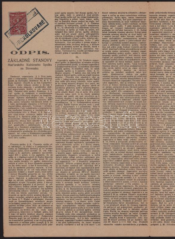 1929 Statutes of the Cultural Association of Hungarians in Slovakia in Slovak, with official approval on the back