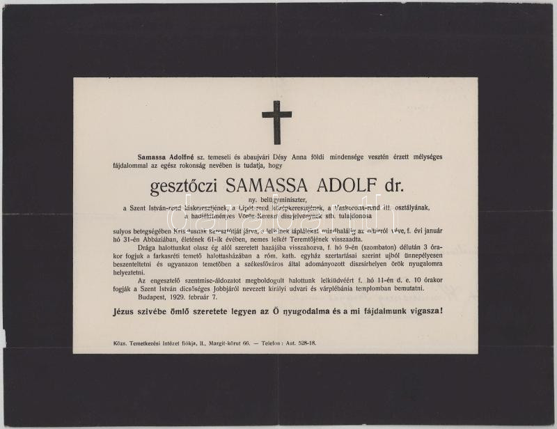 1929 Bp., gesztőczi Samassa Adolf (1867-1929) jogász, belügyminiszter, a Szent István-rend kiskeresztje, a III. oszt. Vaskorona-rend és további kitüntetések tulajdonosa halotti értesítője, kis lapszéli sérülésekkel, 23x30 cm