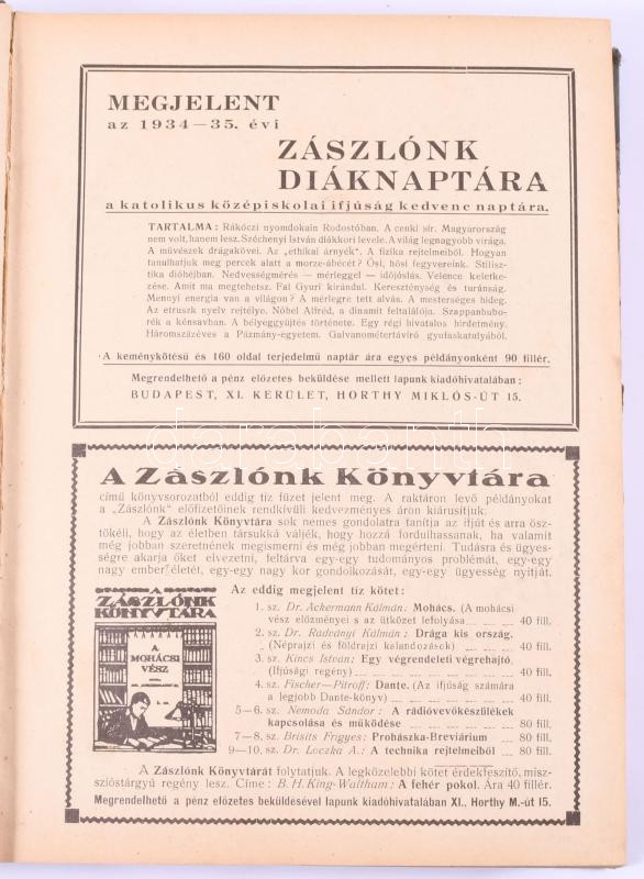 1934-1936 A Zászlónk c. ifjúsági folyóirat számai egybekötve: XXXIII. évf. 1-10. sz., XXXIV. évf. 1-10. sz. (A számokat nem sorrendben kötötték be!) Szerk.: Radványi Kálmán. Márton Lajos és mások illusztrációival. Félvászon-kötésben, kissé viseltes borítóval.