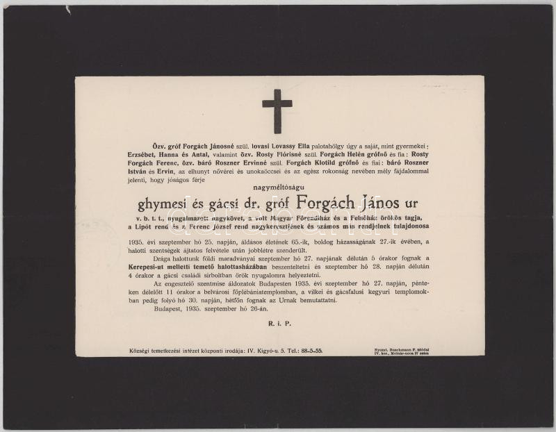 1935 Bp., ghymesi és gácsi gróf Forgách János (1870-1935) nyugalmazott nagykövet, főrendiházi és felsőházi tag, a Lipót-rend és a Ferenc József-rend nagykeresztjének tulajdonosa halotti értesítője, apró lapszéli sérüléssel, 23x29,5 cm