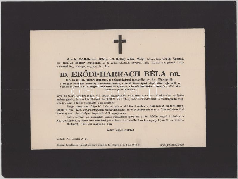 1936 Bp., id. ruttkai Erődi-Harrach Béla (1846-1936) udvari tanácsos, tankerületi főigazgató, a Magyar Földrajzi Társaság tiszteletbeli elnöke, a III. oszt. Vaskorona-rend, a francia Becsületrend és további kitüntetések tulajdonosa halotti értesítője, kis lapszéli sérülésekkel, 22,5x30 cm