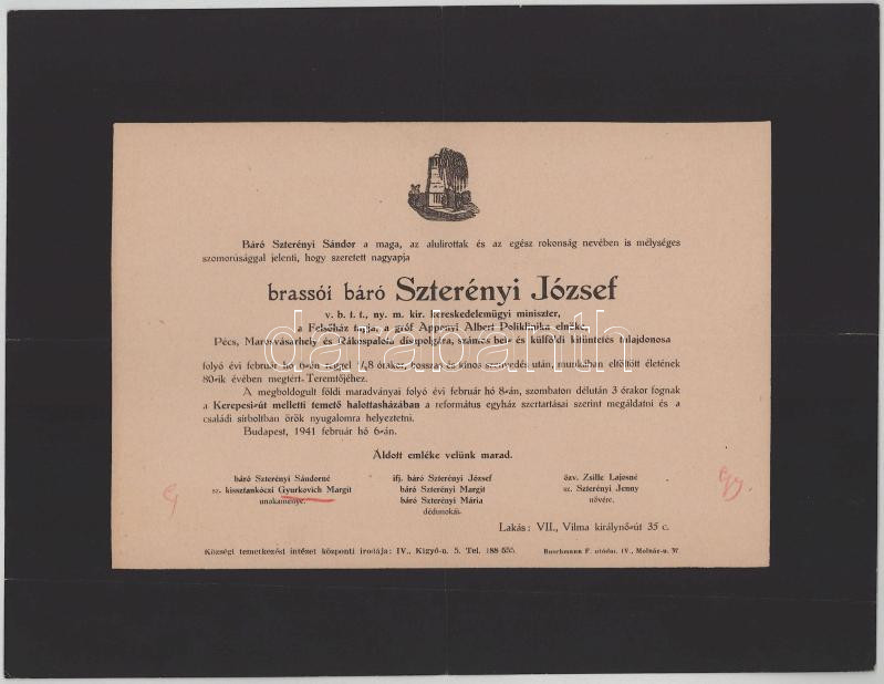 1941 Bp., brassói báró Szterényi József (1861-1941) valóságos belső titkos tanácsos, felsőházi tag, kereskedelemügyi miniszter, a Gróf Apponyi Albert Poliklinika elnöke halotti értesítője, kis lapszéli sérülésekkel, 23x30 cm