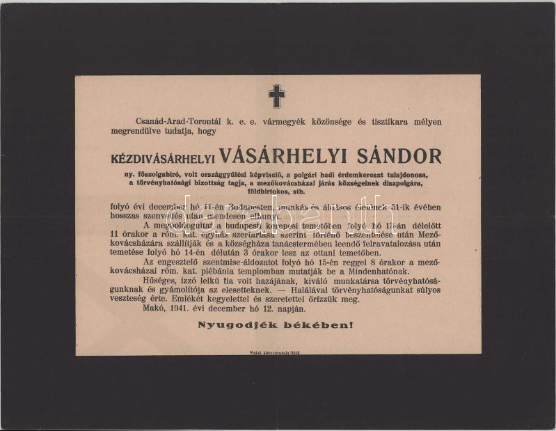 1941 Makó, kézdivásárhelyi Vásárhelyi Sándor (1891-1941)