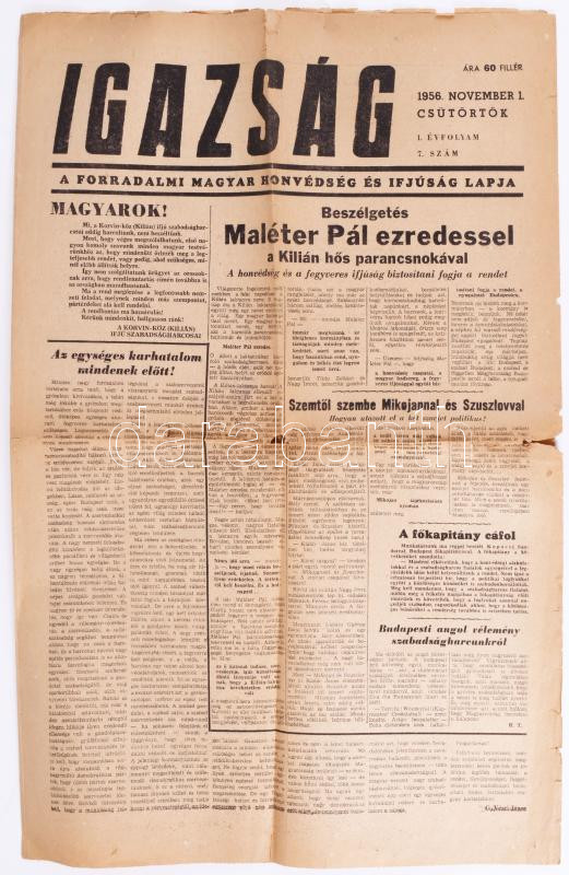 1956. november 1. Az Igazság - A Forradalmi Magyar Honvédség és Ifjúság Lapja I. évfolyamának 7. szám, szakadásokkal, címlapon: Beszélgetés Maléter Pál ezredessel