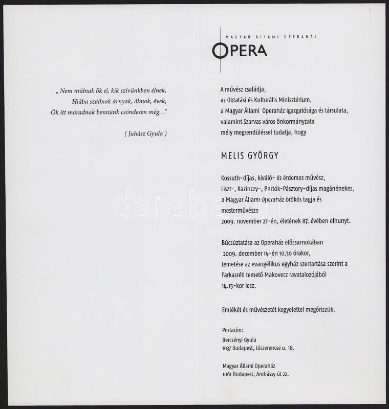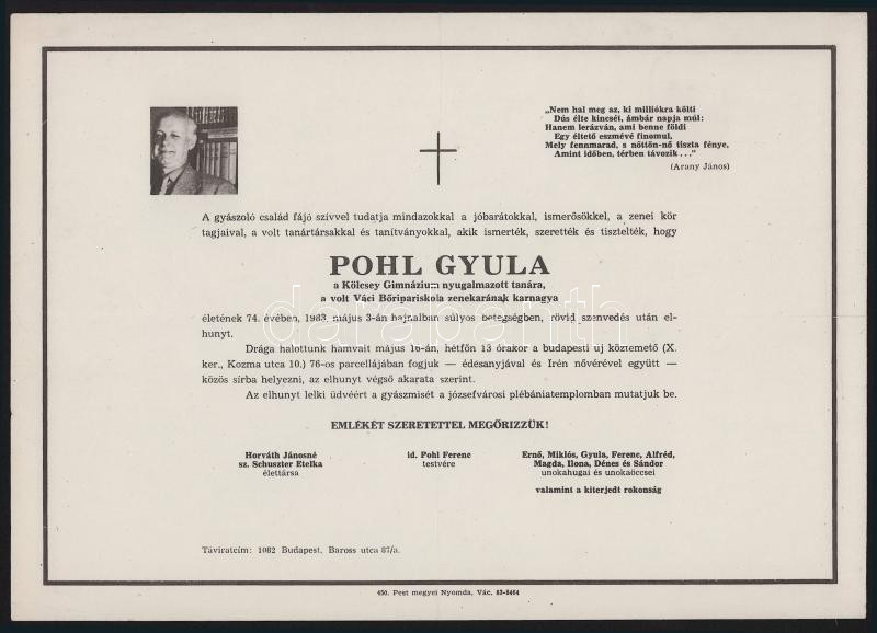 1983, 2009 Pohl Gyula a Kölcsey Gimnázium tanárának és Melis György művész halotti értesítője