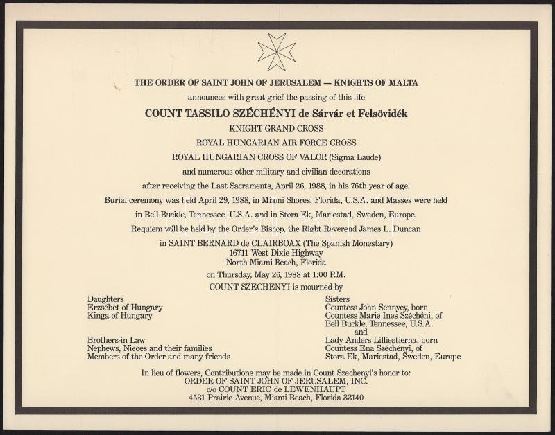 1988 Miami Beach, Florida, Sárvár-felsővidéki gróf Széchényi Tasziló (1912-1988) halotti értesítője