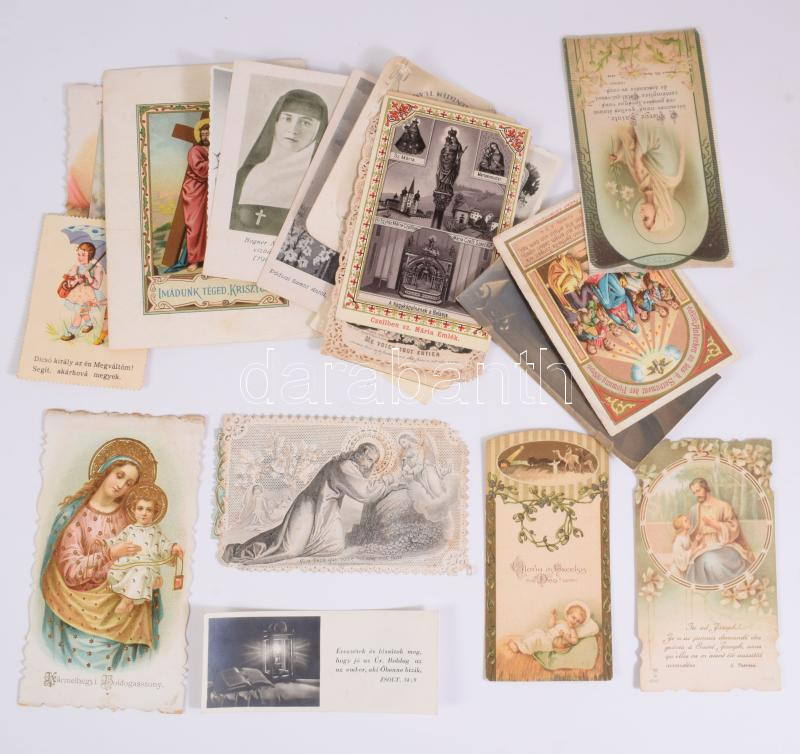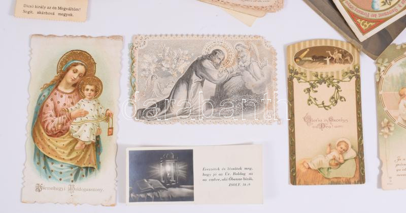 Vegyes szentkép tétel, közte csipkés, litho, textil