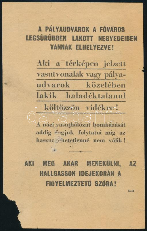 ca 1944 II. világháborús kétoldalas röplap, amely a budapesti pályaudvarok és vasútvonalak közelében élőket elköltözésre szólítja fel, másik oldalán térképpel, sérült, 20x12,5 cm