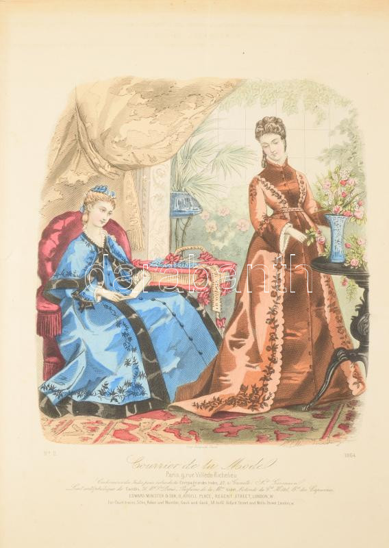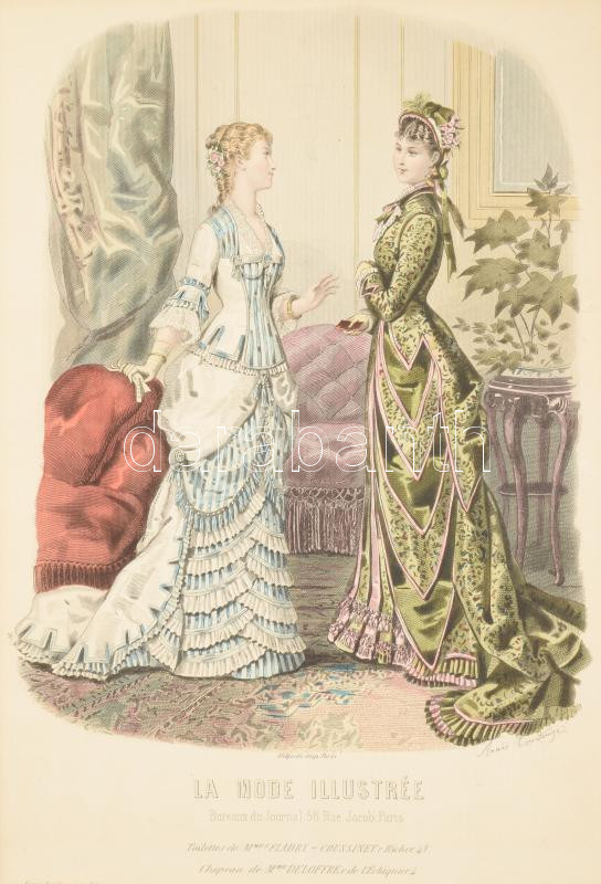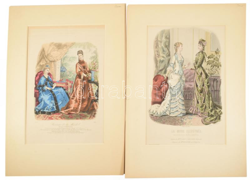 cca 1880 2 db színezett női divatillusztráció, paszpartuban, külső méret: 48x35 cm