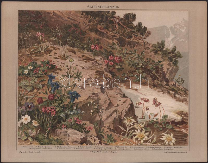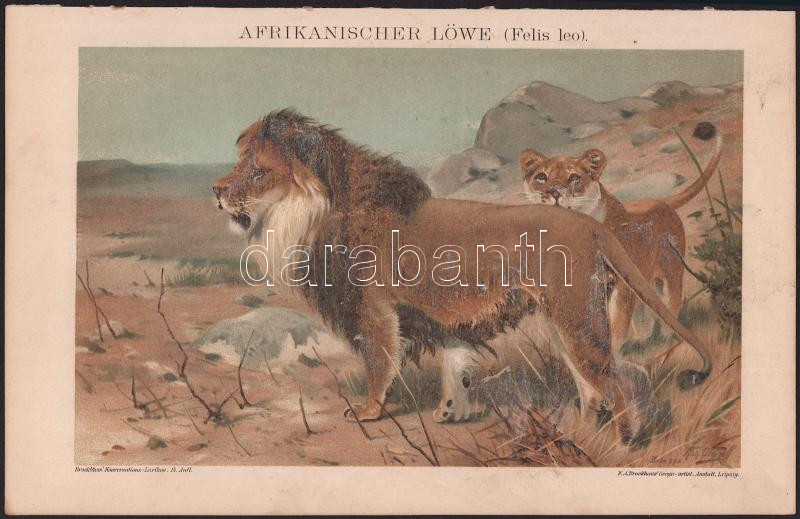 cca 1890-1900 Afrikanischer Löwe (Afrikai oroszlán), Alpenflanzen. Színes litográfia, papír, Lepzig, F. A. Brockhaus, az egyik hajtott, 24x30 cm, 16x25 cm