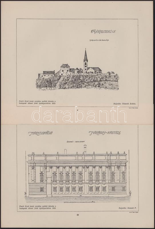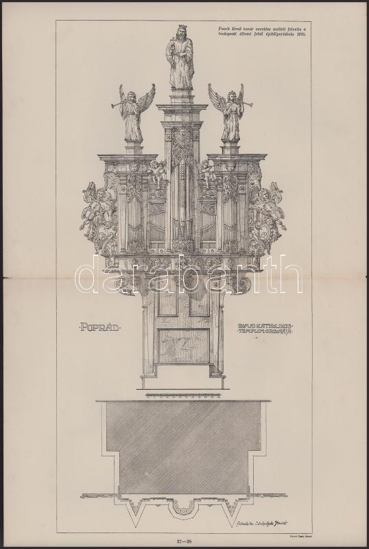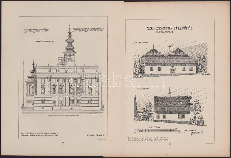 cca 1913-1925 Felvidéki épületek vagy "épületdíszeket" ábrázoló különféle nyomatok, 8 db. Márkusfalva 3 db (1 db látkép, Máriássy-kastély 2 db), Szepesszombati lakóház 1 db, Gölnicbányai szentségház díszei 1 db, Poprád római katolikus templom 2 db, Poprád római katolikus templom orgonája. Foerk Ernő tanár vezetése mellett felvette a Budapesti Állami Felső Építőipariskola. Bp., Korvin Testvérek-ny., 28x23 cm és 56x23 cm közötti méretben