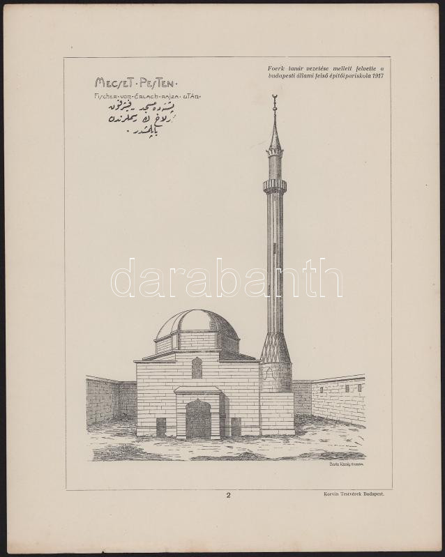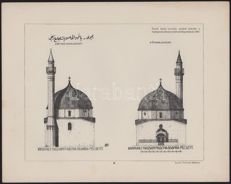 cca 1915-1917 Magyarországi épületeket ábrázoló nyomatok, 4 db: Bp., Battányi tér 4. sz., Szigetvár plébánia templom, Jakovali Hassan Pascha Dsamija pécset, Mecset Pesten. Foerk Ernő tanár vezetése mellett felvette a Budapesti Állami Felső Építőipariskola 1915,1917. Bp., Korvin Testvérek-ny., 28x23 cm