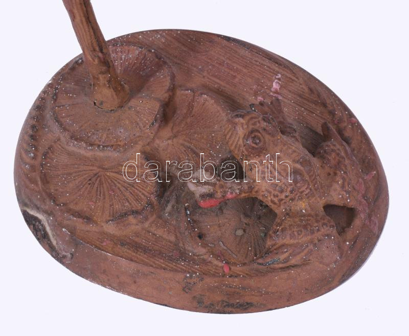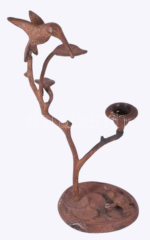 Fém gyertyatartó béka és madár figurákkal díszítve, m: 31 cm