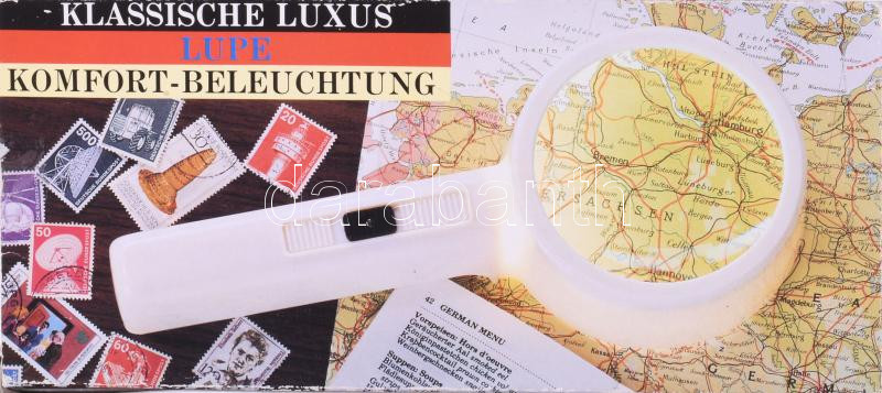 Nagyító, világító funkcióval, működik, dobozában, h. 23 cm