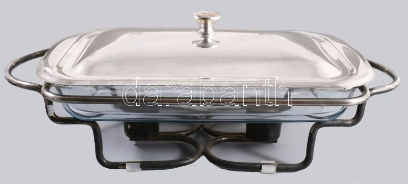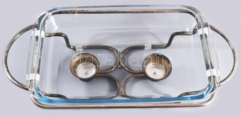 Sütőedény, ezüstözött, két mécsestartót magába foglaló szerelékben, jelzett, 45x23 cm