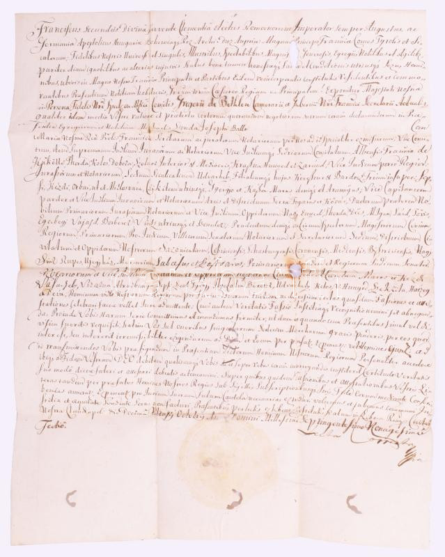 1793 II. Ferenc német-római császár és magyar király oklevele, melyben Bethlen Gergely (1641-1697) erdélyi főnemes, Bethlen Farkas testvérének birtokadományait erősíti meg, Kolozsvár, Szászváros, Vajdahunyad és más erdélyi városok említésével