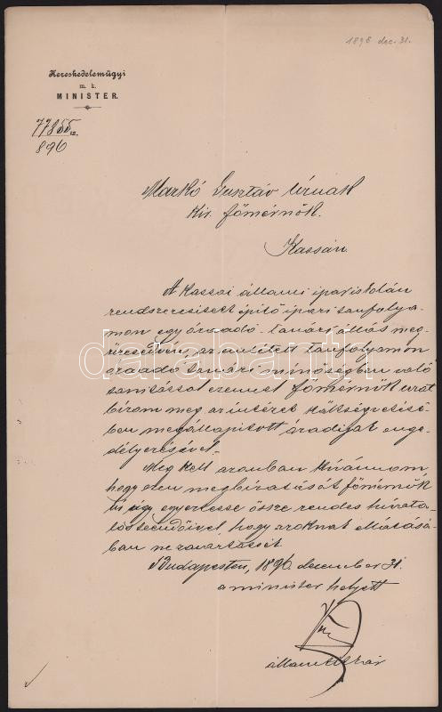 1896 Bp., Vörös László (1848-1925) államtitkár, később kereskedelemügyi miniszter (1905-1906) autográf aláírása kinevezésen