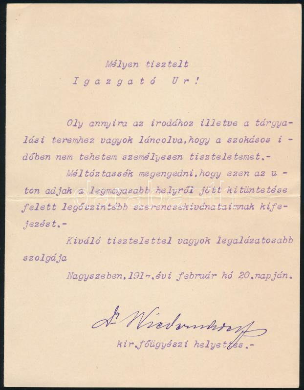 1917 Nagyszeben, Dr. Wiedom Adolf kir. főügyészhelyettes autográf aláírásával ellátott, gépelt levele
