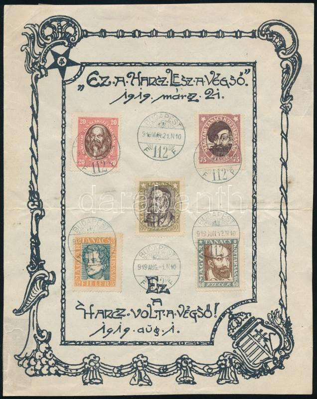 1919 Tanácsköztársaság humoros emléklap Ez a harc lesz a végső - Ez a harc volt a végső, arcképek bélyegsorral és alkalmi bélyegzéssel.