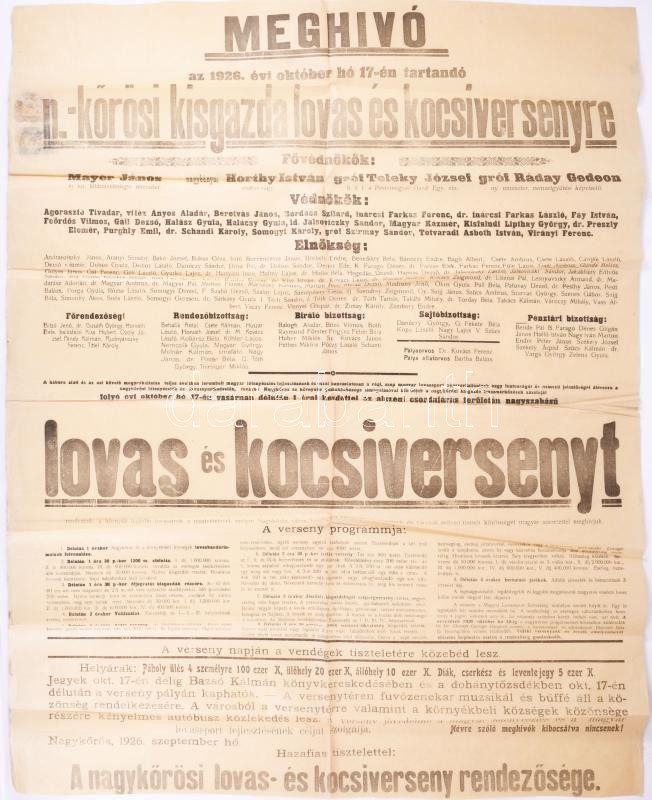 1926 Nagykőrösi lovas és kocsiverseny nagy méretű plakátja, rajta városi illetékbélyegekkel Hajtva, jó állapotban 58x74 cm