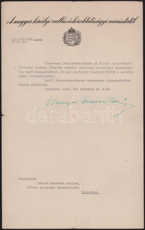 1942 Bp., Szinyei-Mersei Jenő (1888-1957) vallás- és közoktatásügyi miniszter autográf aláírása kinevezésen