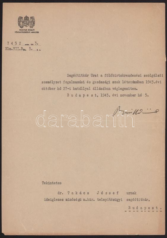1943 Bp., báró Bánffy Dániel (1893-1955) nagybirtokos, politikus, földművelésügyi miniszter (1940-1944) autográf aláírása kinevezésen