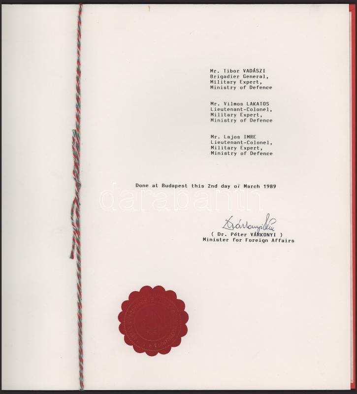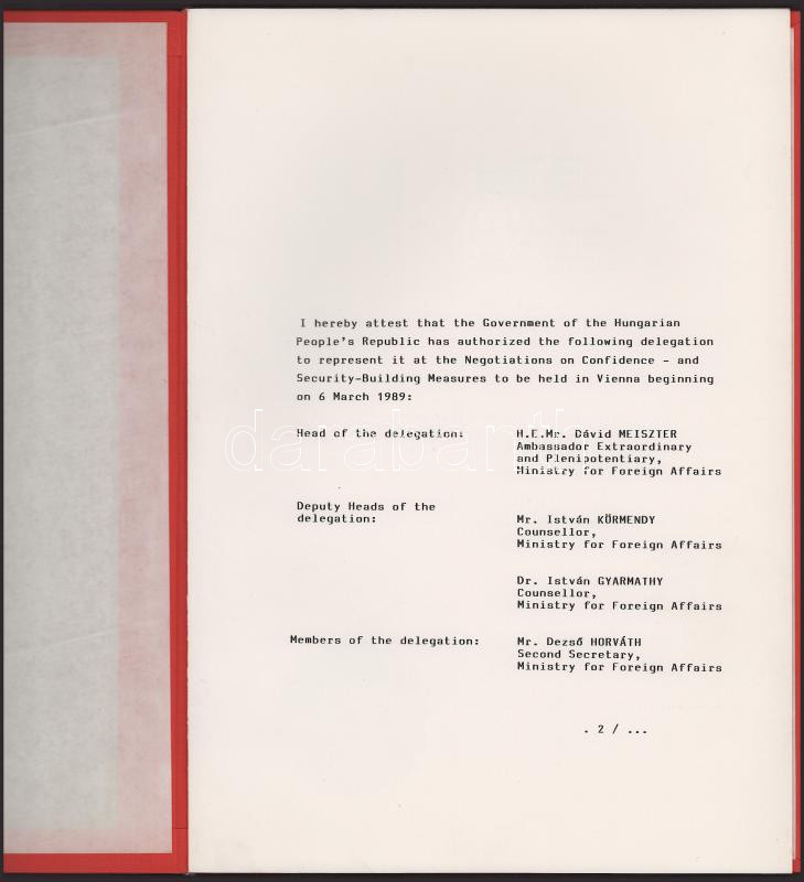 1989 Bp., az 1989. március 6-án Bécsben rendezett Európai Biztonsági és Együttműködési Értekezlet (EBEÉ) magyar delegációjának megbízólevele (tagjai: Meiszter Dávid, Körmendy István, Gyarmathy István, Horváth Dezső, Vadászi Tibor, Lakatos Vilmos, Imre Lajos), Várkonyi Péter (1931-2008) kommunista politikus, diplomata, külügyminiszter aláírásával, eredeti mappában