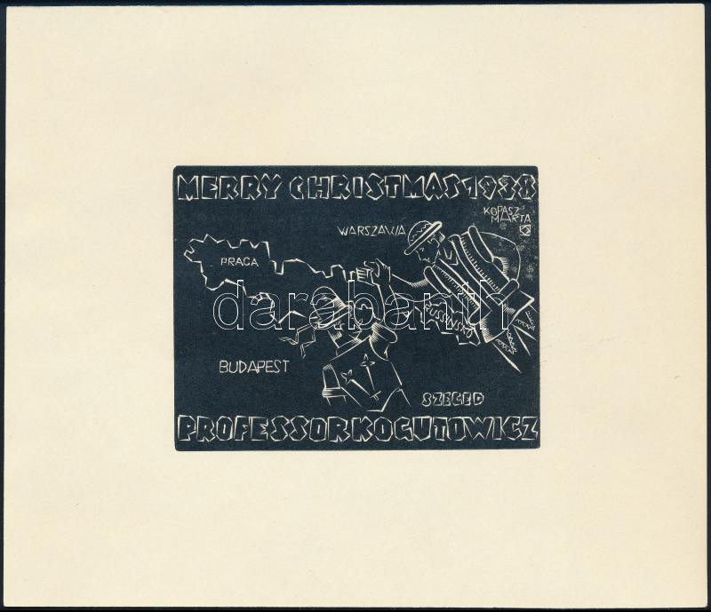 Kopasz Márta (1911-2011): Kogutowicz Károly (1886-1948) geográfus, egyetemi tanár üdvözlete (Merry Christmas 1938) a Felvidék visszacsatolása alkalmából, fametszet, papír, jelzett a dúcon, szép állapotban: 7x8,5 cm, papír méret: 14,5x17 cm