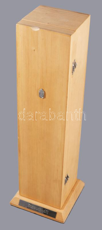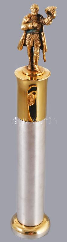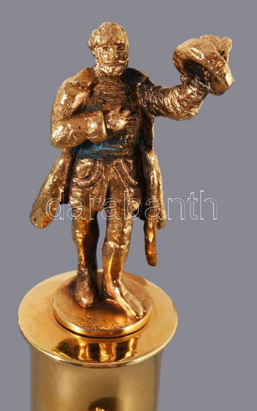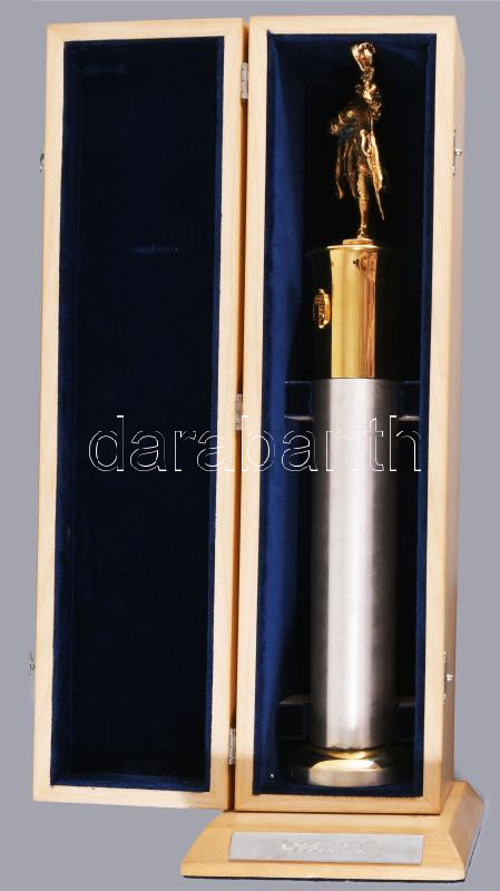 The sculpture of the Kossuth Prize awarded in 1999 to Rózsa Polgár (1936?2014), textile artist, recipient of the Kossuth Prize and the Mihály Munkácsy Prize, and founding member of the Széchenyi Academy of Letters and Arts. Gilded statue of Lajos Kossuth mounted on a gilded and silvered copper cylinder, housed in a velvet-lined wooden presentation case; height: 34.5 cm, case height: 39 cm.