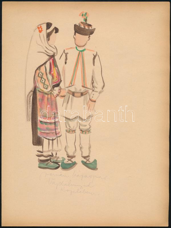 cca 1935 Erdélyi román házaspár Vajdahunyad közelében, akvarell, papír, feliratozva, 26×19 cm