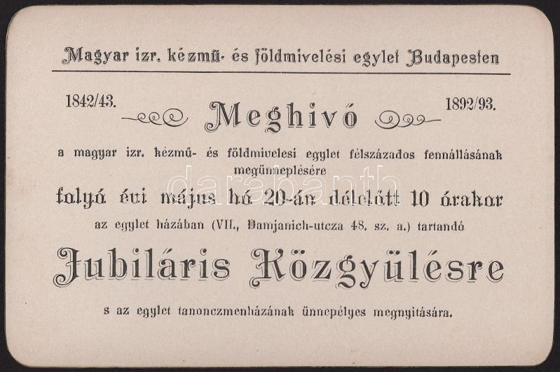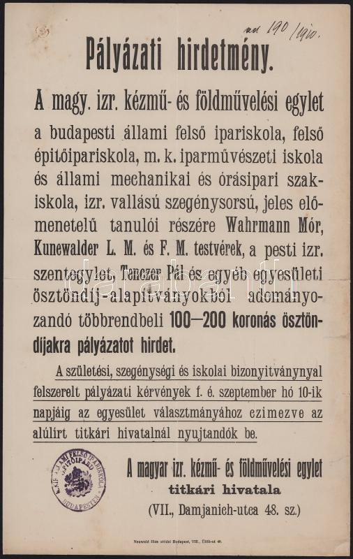 1892, 1910 A magyar izraelita kézmű- és földműves egylet meghívója az 50 éves fennállása alkalmából tartandó jubiláris közgyűlésre, továbbá pályázati hirdetmény szegény sorsú tanulók részére ösztöndíj megszerzésére , pecsételve, kisebb javításokkal, 2 db okmány