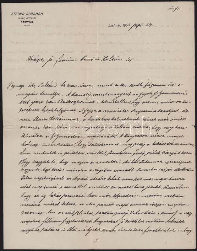 1913 Szatmár, Steuer Ábrahám rabbi, saját kezű levele fiának fejléces papírján / Satu Mare Ábrahám Steuer rabbi's letter