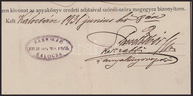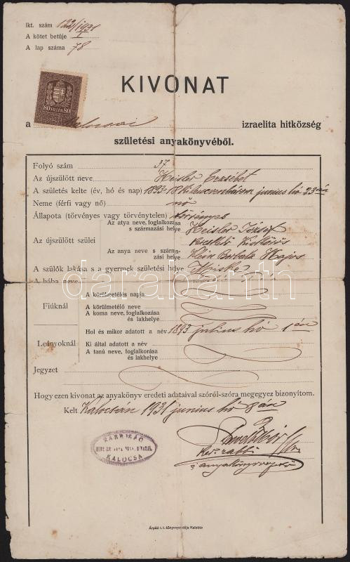 1931 Kalocsa, Schwelb Mór (Pozsony, 1863 - Auschwitz, 1944) anyakönyvvezető rabbi által kitöltött és aláírt születési anyakönyvi kivonat, 80f okmánybélyeggel, viseltes állapotban