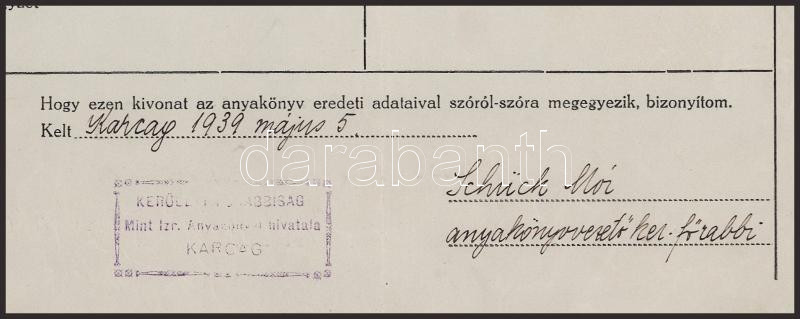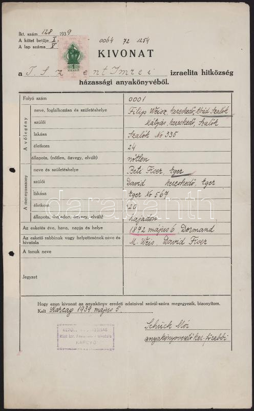 1939 Karcag, Schück Mór (1874-?) anyakönyvvezető főrabbi által kiállított házassági anyakönyvi kivonat, 1P okmánybélyeggel