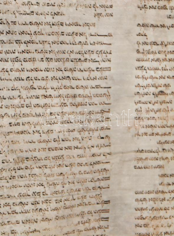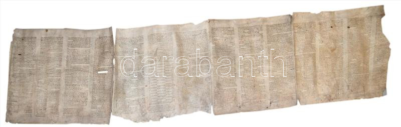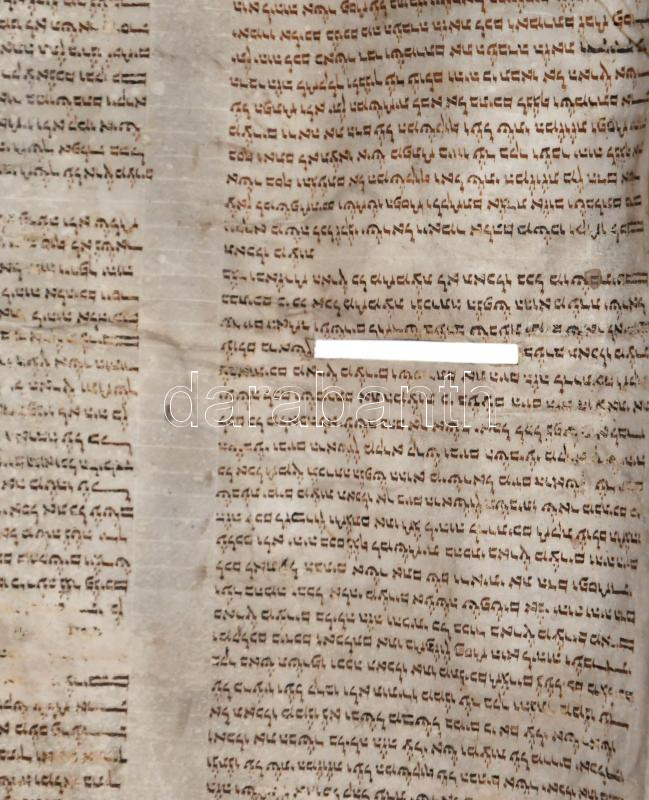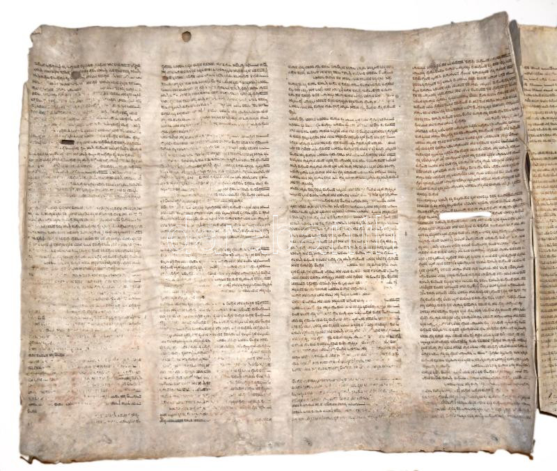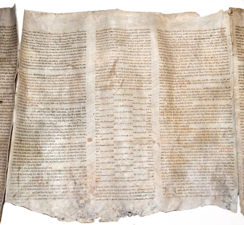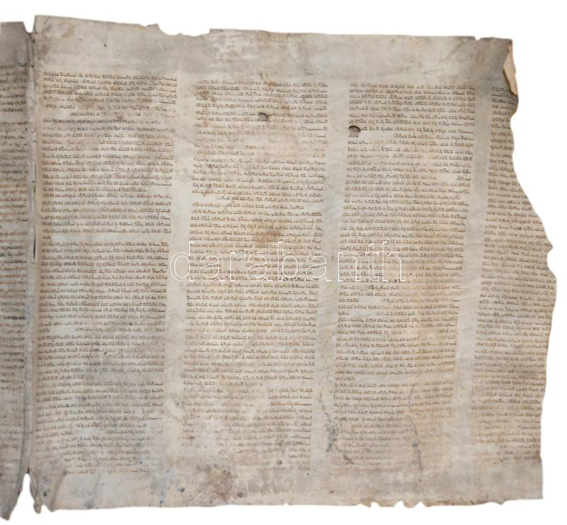 Régi Tóra tekercs töredéke, pergamen, hiányos, sérült, foltos, penészes, cca 54x230 cm.