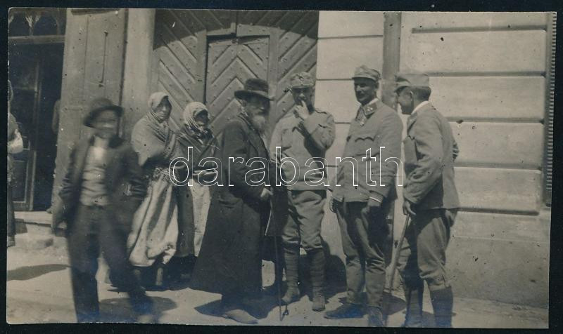 cca 1916 Zsidók Bukarestben katonákkal, hátoldalon feliratozott fotó, 6×10 cm